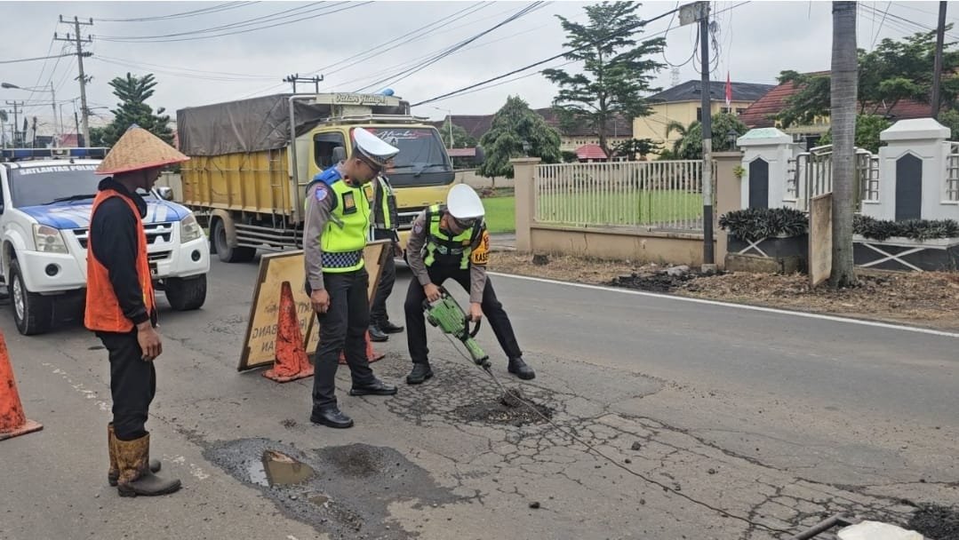 Satlantas Polres Musi Rawas Lakukan Penambalan Jalan Berlubang di Jalan Lintas Km. 12