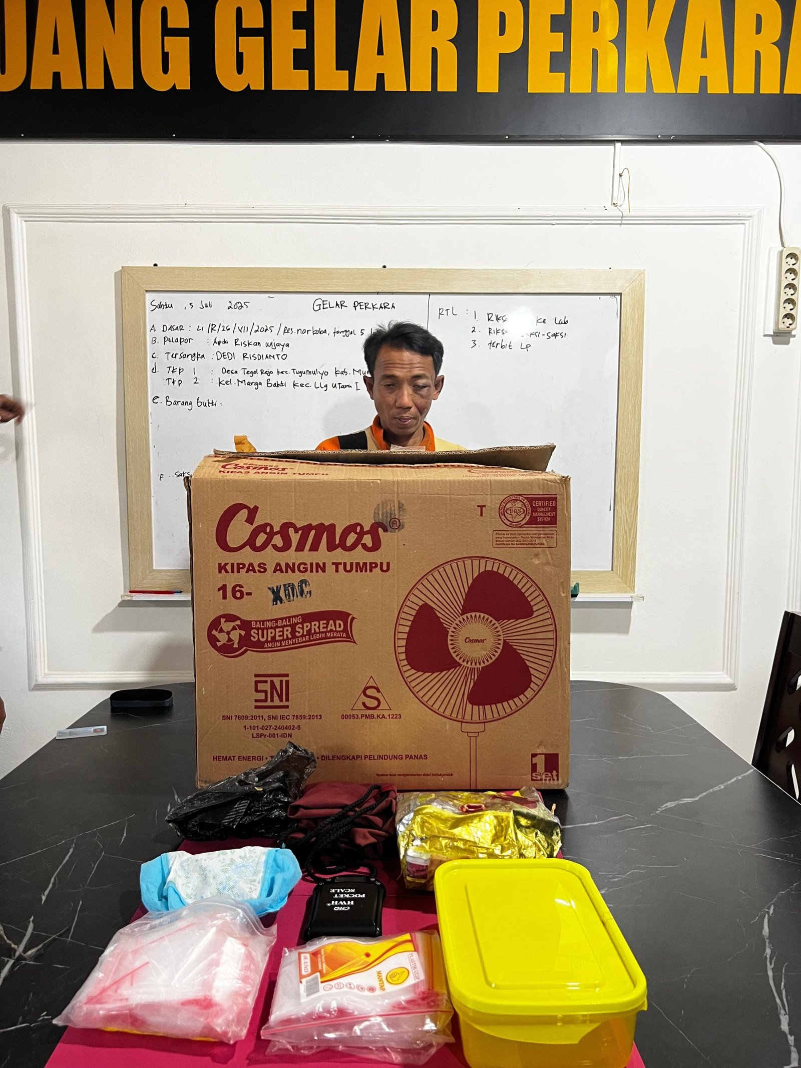 Setelah dilakukan penggeledahan di dalam rumah tersangka, personel berhasil menemukan BB berupa satu buah kardus kipas angin merk Cosmos warna coklat yg di dalamnya berisikan satu buah tas warna merah yang didalamnya terdapat tas warna biru yang berisikan satu bungkus plastik teh Cina merk GUANYINWANG, berisikan kristal putih yang diduga narkotika jenis sabu sebanyak enam bungkus plastik klip ukuran sedang dan satu bungkus plastik bening ukuran besar dengan berat bruto 460 gram, beserta satu unit timbangan digital merk pokes scale, satu buah kotak plastik warna bening tutup warna kuning dan tiga ball plastik klip kosong.
